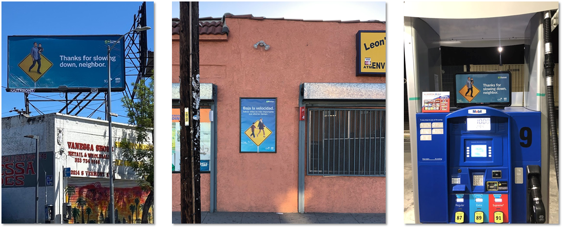 - Ran targeted ads in English and Spanish throughout August 2020 on billboards, bus shelters, gas pumps and other strategic placements, reminding drivers to slow down.