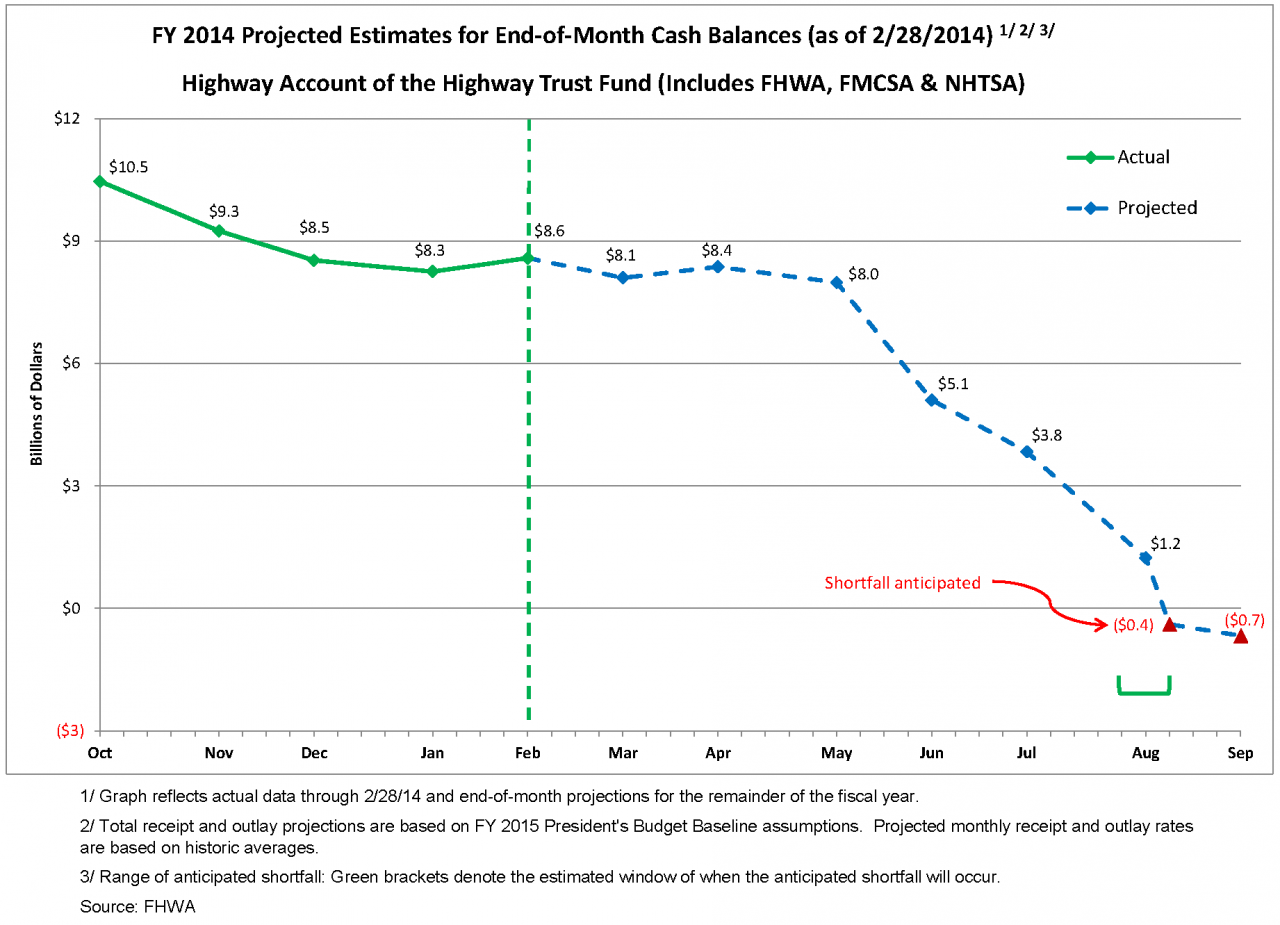 ​Based on current spending and revenue trends, the U.S. Department of Transportation estimates that the Highway Account of the Highway Trust Fund will encounter a shortfall before the end of fiscal year (FY) 2014. See USDOT HTF Ticker for more details.
